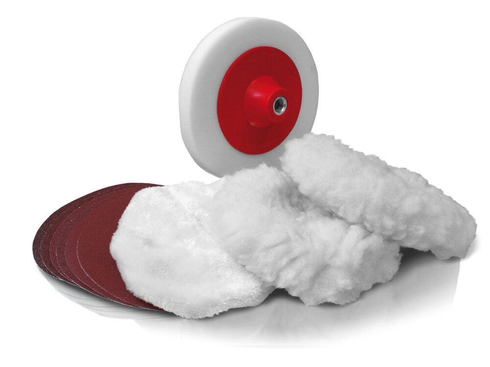 1 Synthetik-Polierhaube, 180 mm Ø, 2 Lammfell-Polierhauben, 180 mm Ø, 1 Schwamm, 180 mm Ø, 2 Schleifpapier-Klettscheiben K 60, 200 mm Ø, 2 Schleifpapier-Klettscheiben K 80, 200 mm Ø, 2 Schleifpapier-Klettscheiben K 100, 200 mm Ø