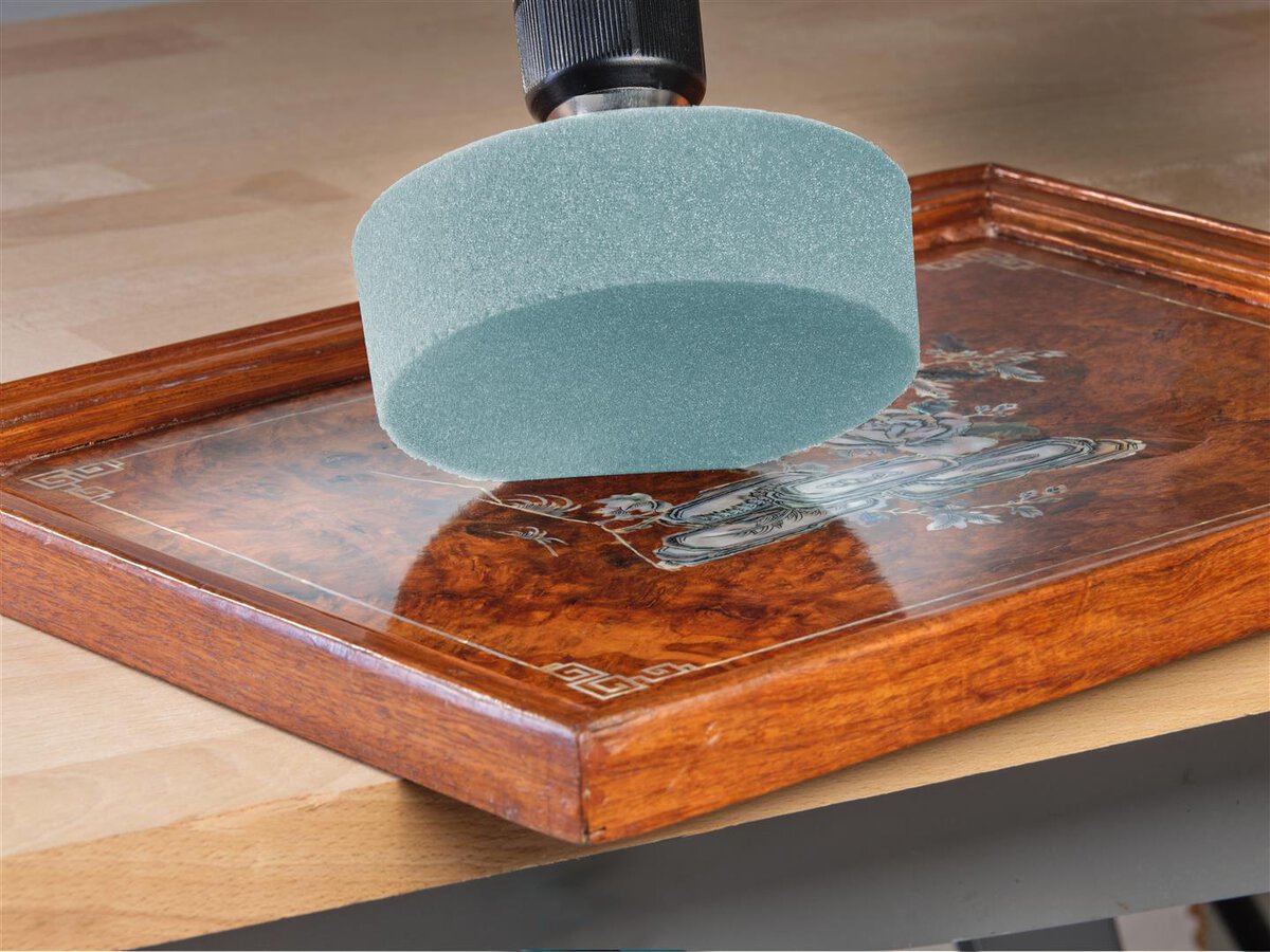 Mit der sanften Politur bringt der Polierschwamm aus Schaumstoff Metalle auf Hochglanz und Holz zu einer glatten und feinen Oberfläche. Der einfache Einsatz mit handelsüblichen (Akku-)Bohrmaschinen erfordert keine spezielle Poliermaschine. Dabei ist der Kraftaufwand gering, da der Haftstützteller die Druckverteilung übernimmt. Polieren wird spielend einfach.