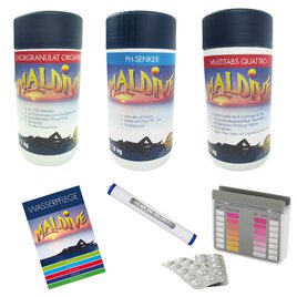 1 Chlor- und pH-Tester, für Pool und Spa, zum schnellen und einfachen Prüfen des Chlor- und pH-Wertes, 1 kg Multi-Tabs (20 g-Tabletten), ideal für alle Pools und Aufstellbecken, dauerhafte Desinfektion, Algenverhütung und Flockung in einem, Tabletten langsam löslich, 1 kg Chlor-Granulat, organisch, schnell löslich, kalkfrei, keine pH-Beeinflussung, sehr gut für Stoßdosierung und zur Algenbekämpfung, für mittelhartes bis hartes Wasser, 1,5 kg pH-Senker-Granulat, rückstandsfreies, lösliches Granulat bzw. Pulver, saure bzw. alkalische Reaktion, 1 Wasserpflege-Anleitung, 1 kleines Thermometer