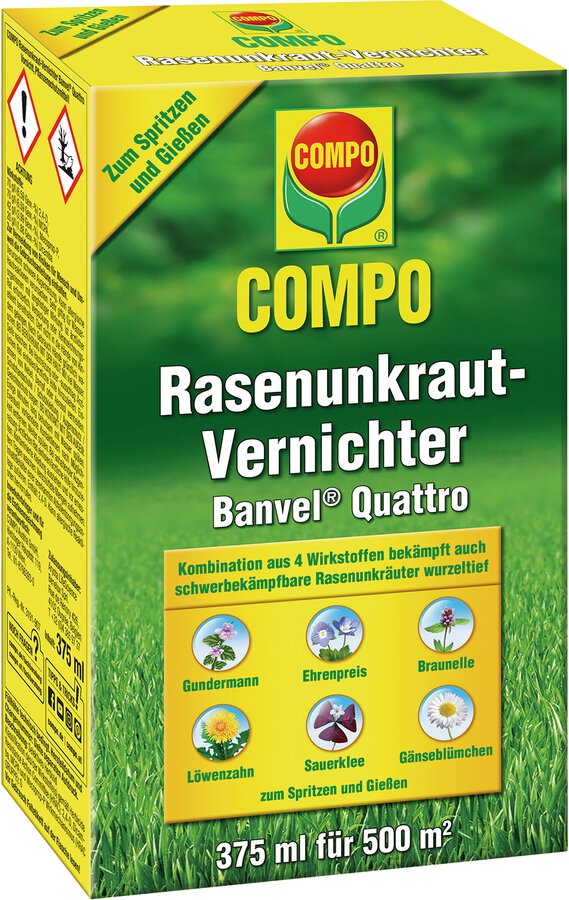 systemisches Rasenherbizid als anwendungsfertiges Produkt, die Kombination aus 4 Wirkstoffen vernichtet 37 Unkräuter, darunter viele schwer bekämpfbare Unkräuter wie Gundermann, Ehrenpreis, Löwenzahn etc. bis in die Wurzel, schont die Rasengräser und wirkt zuverlässig über das Blatt bis in die Wurzel, zum Gießen und Spritzen