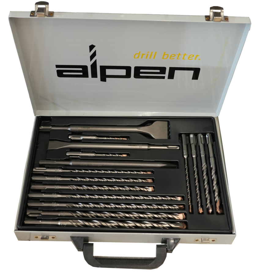 Ø 5 und Ø 6 x 110 mm, Ø 6, 8, 10 und 12 x 160 mm, Ø 6, 8 und 10 x 210 mm, Ø 8, 10, 12 und 14 x 260 mm, 1 SDS-Plus Spitzmeißel 250 mm, 1 SDS-Plus Flachmeißel 20 x 250 mm, 1 SDS-Plus Breitmeißel 40 x 250 mm, im Metall-Koffer