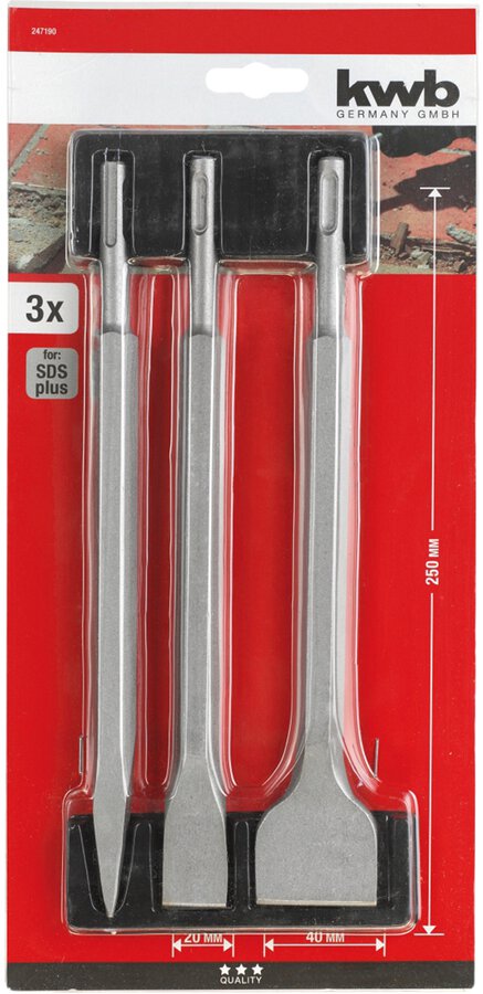 Inhalt: 1 Spitzmeißel, 250 mm lang, 1 Flachmeißel, 20 x 250 mm lang, 1 Fliesenmeißel, 40 x 250 mm lang