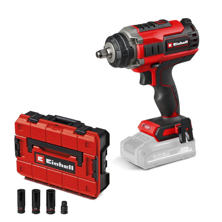 1x Akku-Schlagschrauber, Nuss-Set (1x 17 mm, 1x 19 mm, 1x 21 mm), 1x Bit-Adapter, 1x E-Case S-F, 1x Gürtelclip