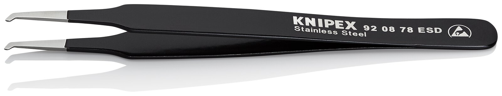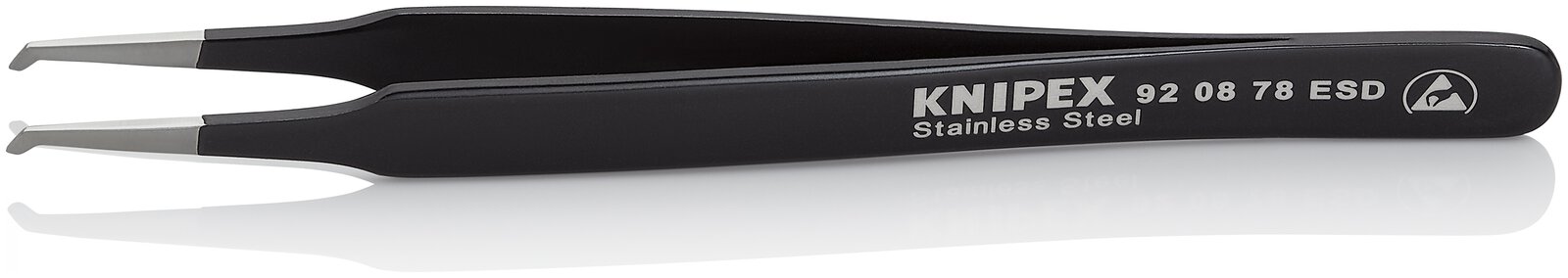 92 08 78 ESD SMD-Präzisionspinzette Für Arbeiten an SMD-Bauelementen (SMD=Surface mounted device): Die feine Geometrie der SMD-Pinzetten erlaubt Arbeiten auch an elektronischen Bauteilen, die sich mittels lötfähiger Anschlussflächen direkt auf die Platine löten lassen. In Handarbeit gefertigt: mit polierten Kanten und hervorragend mattierter, kratz- und spiegelfreier Oberfläche. Für Montagearbeiten, Laborprozesse, Reinraumumgebungen, Leiterplattenreparaturen und Nacharbeiten in der Elektronikindustrie. Hochwertiger Premium-Edelstahl: hohe Temperaturbeständigkeit und exzellente Korrosionsbeständigkeit gegenüber den meisten Chemikalien, Salzen und Säuren. Antimagnetisch zur Vermeidung elektromagnetischer Schäden. Die Vielfalt der Formen und Backenausführungen ermöglicht ein sicheres Halten, Positionieren und Kontrollieren von kleinen Komponenten auf engstem Raum. Erlauben den kontrollierten Ausgleich von Potenzialunterschieden zwischen Bediener und elektronischen Bauteilen. Mit geprüfter, schwarzer Epoxidbeschichtung mit einem Oberflächenwiderstand zwischen 10^3 und 10^9 Ohm. - Oberfläche: Mattiert - Ausführung: gewinkelt 45° - Spitzenbreite (A): 0,5mm - Spitzenbreite (B): 2,5mm - Ausführung Pinzettenspitze: Positionieren - Korrosionsbeständig: ja - Säurebeständigkeit: Sehr gut - ESD-geprüft: ja - VDE-geprüft: nein - Branchen: Elektronik - Magnetisch: Nicht magnetisierbar (80%) - Verhalten: ableitend