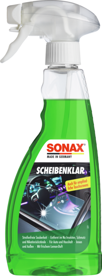 Scheibenklar, SONAX, 500 ml, Glasreiniger für streifenfreie Sicht, beseitigt schnell und einfach Schmutz, Insekten, Abgasreste sowie Schmierfilme und Nikotin-Rückstände von Scheinwerfern, Scheiben und Spiegeln, auch für den Haushalt geeignet, Phosphat-frei