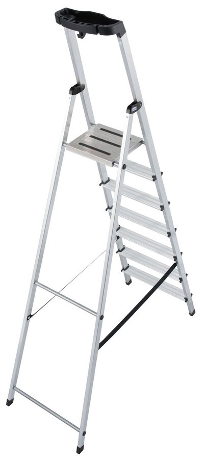 Die leichte und sichere Stufen-Stehleiter mit ergonomisch geformter Multifunktionsschale und rutschhemmender Plattform.