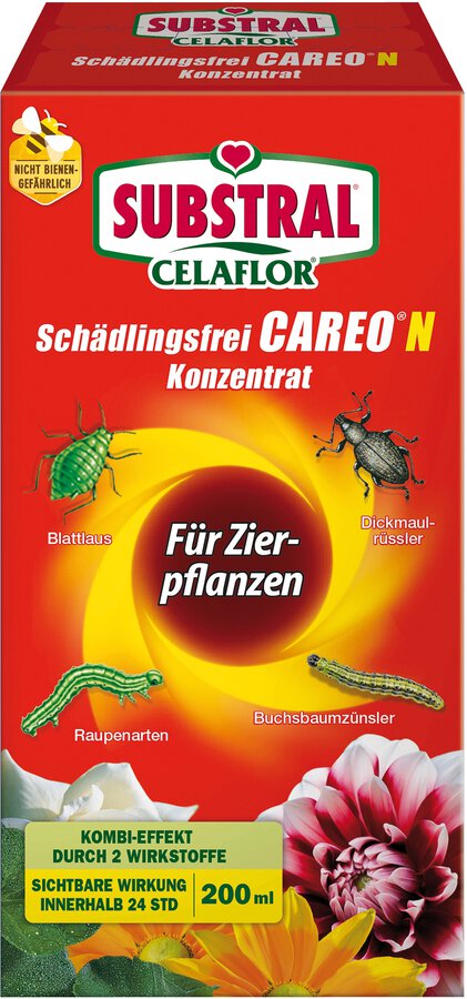 bekämpft Blattläuse, Spinnmilben, blattfressende Käfer, Schild-, Woll- und Schmierläuse im Zierpflanzenbau, zur Befallsmilderung bei Befall durch Schmetterlingsraupen