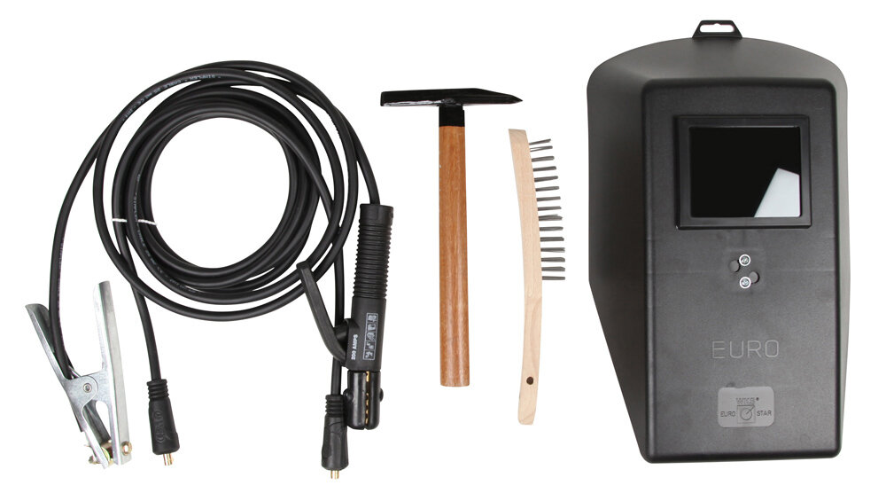 Schweißschirm, Elektrodenhalter, Schlackenhammer und Stahldrahtbürste