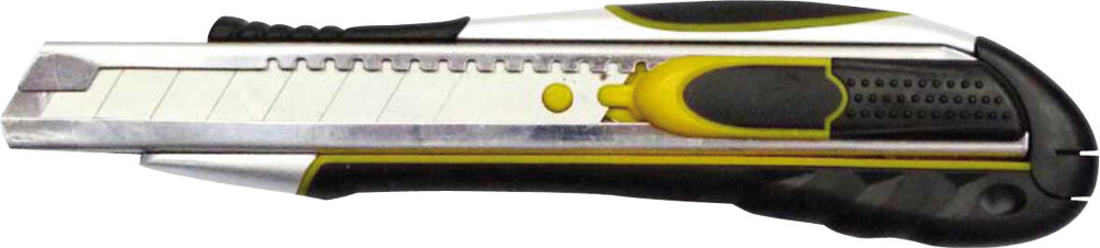 Zink-Druckguss-Gehäuse, 2-geteilter Vorschubhebel (Sicherheitshebel mit automatischer Rückzug-Funktion und Fixierhebel) inkl. 1 SK 5-Cutter-Klinge 100 x 18 mm, Gewicht: ca. 160 g, Farbe: schwarz/gelb/grau