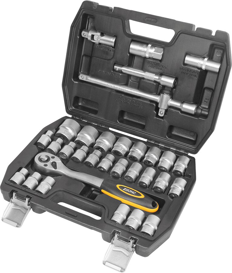 19 Stecknüsse 1/2": 5/16, 11/32, 3/8, 7/16, 15/32, 1/2, 9/16, 19/32, 5/8, 11/16, 23/32, 3/4, 25/32, 13/16, 7/8, 15/16, 1-1/16, 1-3/16 und 1-1/4",