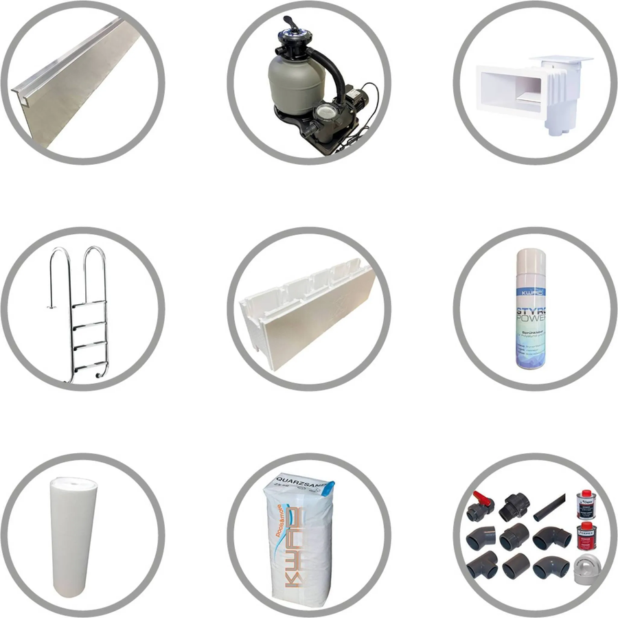 Die passgenaue blaue Innenfolie (0,6 mm, hochfrequenzverschweißt) mit Keilbiese-Aufnahme sorgt für eine sichere und dichte Auskleidung des Beckens. Dank des mitgelieferten Komplettsets sind alle notwendigen Komponenten für die Inbetriebnahme enthalten – von der Sandfilteranlage mit Filtersand über Skimmer, Einlaufdüsen und Verrohrungsmaterial bis hin zur Edelstahlleiter.