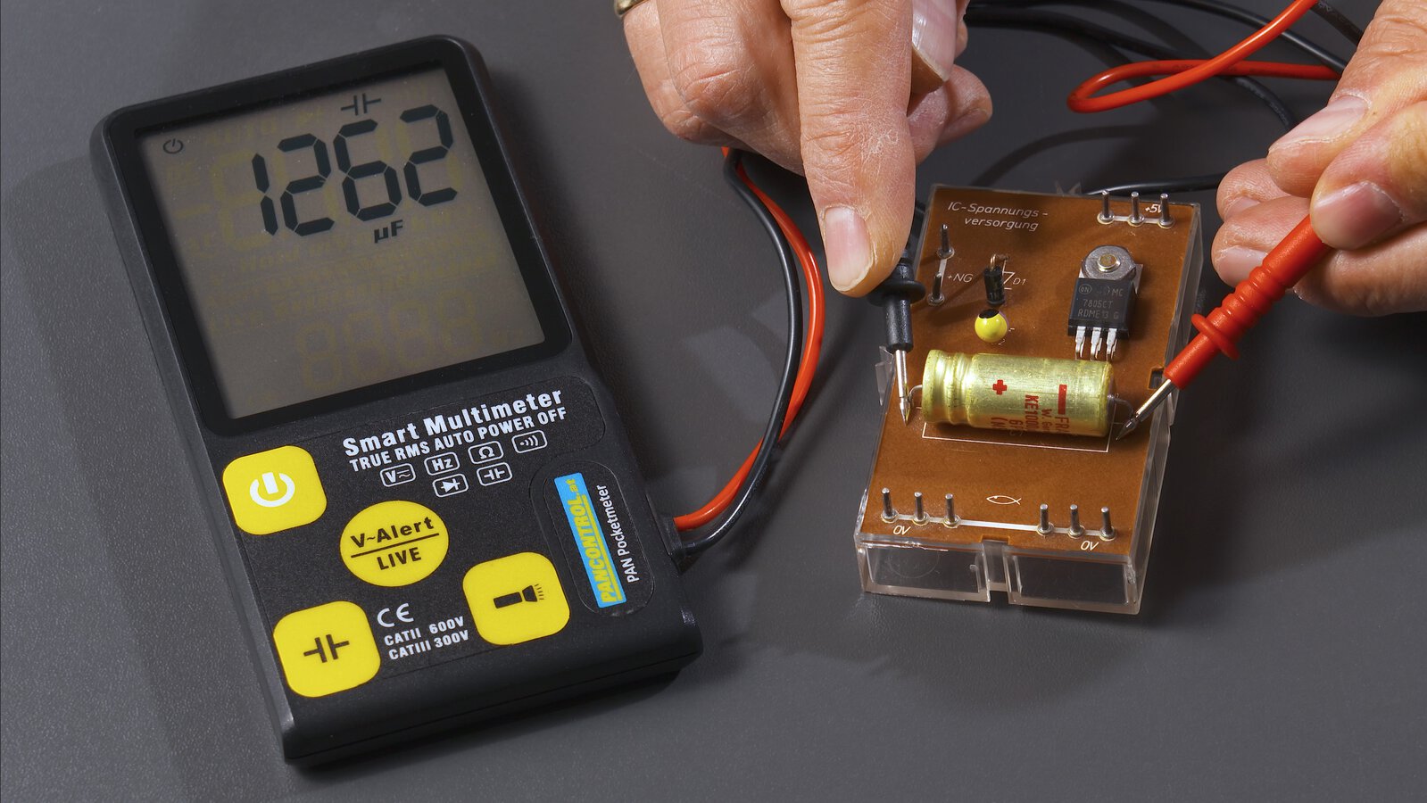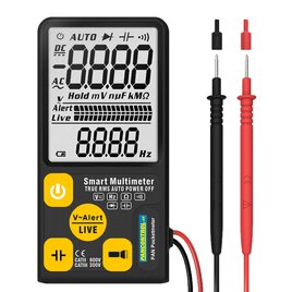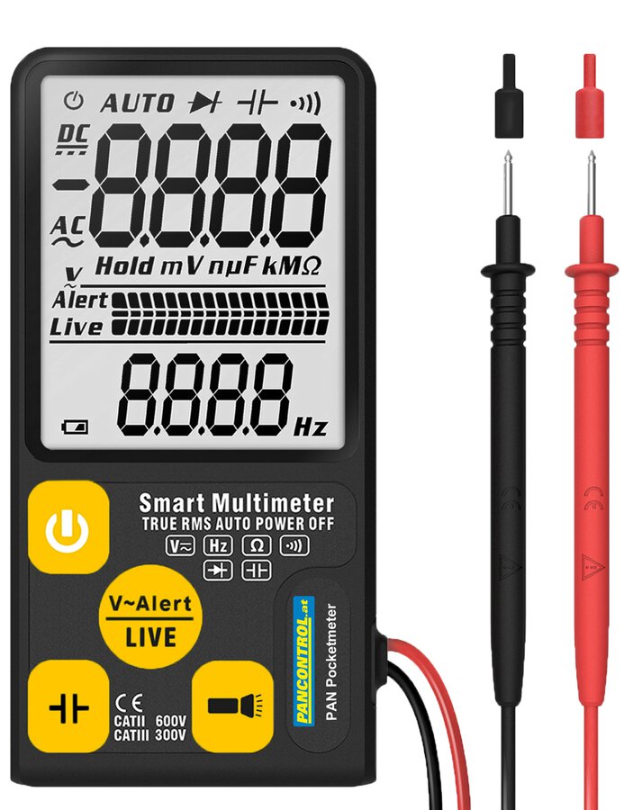Automatische Funktions- und Bereichswahl, True RMS (Echt-Effektivwert-Messung), Kontaktloser Spannungsprüfer mit dreistufiger Anzeige, Gleich- und Wechselspannungsmessung: Gleichspannung DC (V=): 0,1 mV - 600 V, Wechselspannung AC (V~): 0,1 V - 600 V, Widerstand-, Frequenz- und Kapazitätsmessung: Widerstand (Ω ): 1 Ω - 10 MΩ, Frequenz (Hz): 1 Hz - 1000 Hz, Kapazität (F): 0,1 µF - 6000 µF, Akustischer Durchgangsprüfer: <30Ω, Diodentest