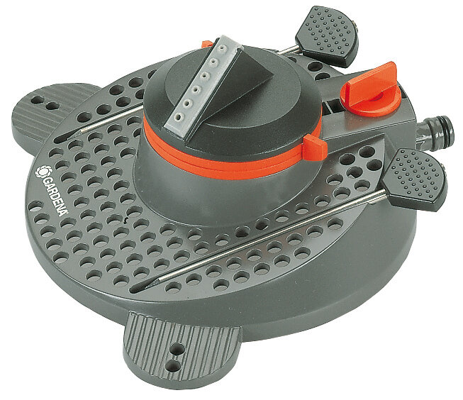 integriertes Schmutzsieb, komplett mit Regnerfuß sowie 2 massiven Metalldornen für optimalen Stand bei Hanglage oder unebenem Boden