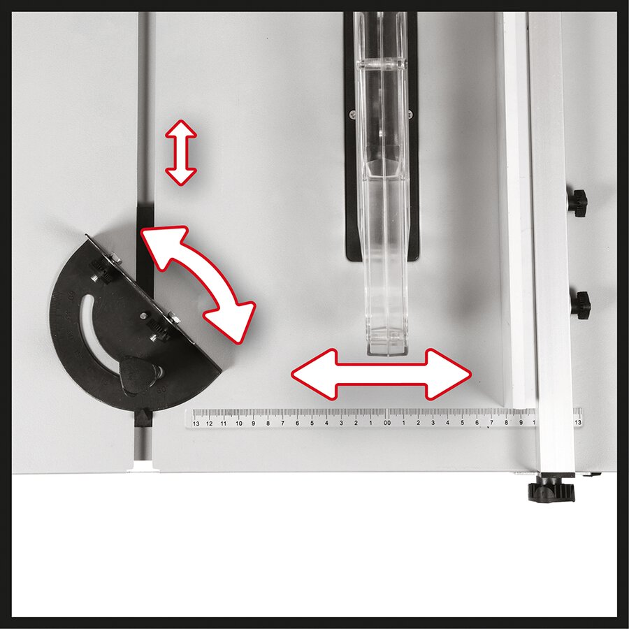 stufenlos einstellbare Schnitthöhe 0 - 45 mm, Neigungswinkel: 0 - 45° nach links, Sägeblattschutz mit Späneabsaugvorrichtung 36 mm Ø, verstellbarer Parallelanschlag mit beidseitiger Klemmung