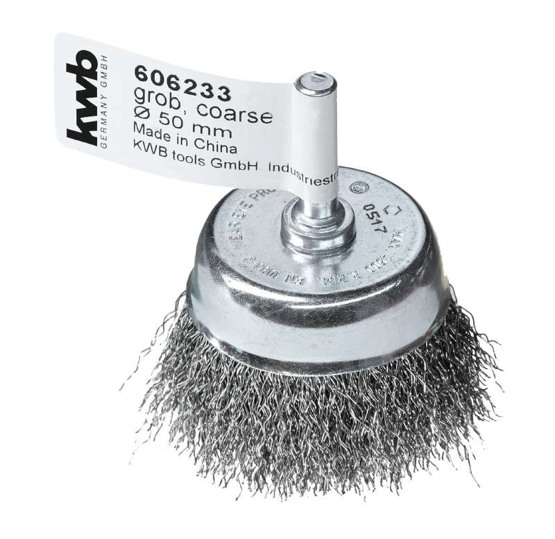Die grobe kwb Topfbürste für Bohrmaschinen hat gewellte Borsten aus HSS Stahldraht. Die Drahtbürste ist ideal zum Reinigen von Schalungsbrettern, Entrosten, Entfernen von Farbe und Lack sowie Aufrauen von Materialen, an mittelgroßen Flächen, bei Metall und Stein.