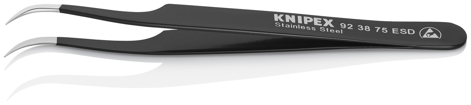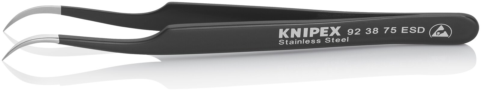92 38 75 ESD Universalpinzette ESD Für den sicheren Umgang mit elektronischen Bauteilen in Feinanwendungen: erlauben den kontrollierten Ausgleich von Potenzialunterschieden zwischen Bediener und Bauteil. ESD-geprüfte, schwarze Epoxidbeschichtung mit einem Oberflächenwiderstand zwischen 10^3 und 10^9 Ohm. Für Elektronik- und Feinmechanikindustrie. Antimagnetisch zur Vermeidung elektromagnetischer Schäden. Große Modellpalette: gerade, gewinkelt, Greiffflächen und Griffe glatt oder gezahnt, mit nadelspitzen, spitzen oder stumpfen Spitzen. Der hochwertige Edelstahl bietet eine hohe Zähigkeit und eine sehr gute Korrosionsbeständigkeit gegenüber einer Vielzahl von atmosphärischen Umgebungen und vielen korrosiven Materialien. Auch im Set erhältlich (92 00 01 ESD). - Oberfläche: Mattiert - Ausführung: gewinkelt 35° - Spitzenbreite (A): 0,25mm - Spitzenbreite (B): 0,3mm - Ausführung Pinzettenspitze: Nadelspitz - Korrosionsbeständig: ja - Säurebeständigkeit: Sehr gut - ESD-geprüft: ja - VDE-geprüft: nein - Branchen: Elektronik - Magnetisch: Nicht magnetisierbar (80%) - Verhalten: ableitend