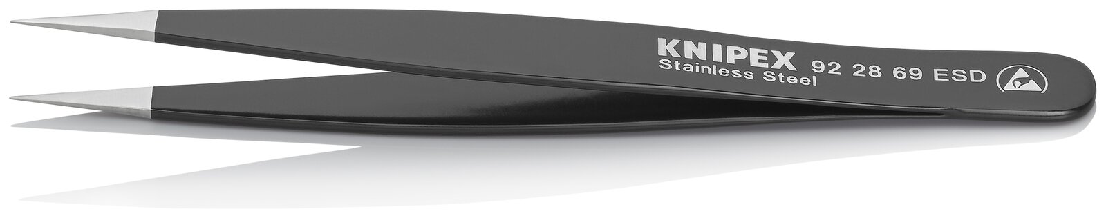 92 28 69 ESD Universalpinzette ESD Für den sicheren Umgang mit elektronischen Bauteilen in Feinanwendungen: erlauben den kontrollierten Ausgleich von Potenzialunterschieden zwischen Bediener und Bauteil. ESD-geprüfte, schwarze Epoxidbeschichtung mit einem Oberflächenwiderstand zwischen 10^3 und 10^9 Ohm. Für Elektronik- und Feinmechanikindustrie. Antimagnetisch zur Vermeidung elektromagnetischer Schäden. Große Modellpalette: gerade, gewinkelt, Greiffflächen und Griffe glatt oder gezahnt, mit nadelspitzen, spitzen oder stumpfen Spitzen. Der hochwertige Edelstahl bietet eine hohe Zähigkeit und eine sehr gute Korrosionsbeständigkeit gegenüber einer Vielzahl von atmosphärischen Umgebungen und vielen korrosiven Materialien. Auch im Set erhältlich (92 00 01 ESD). - Oberfläche: Mattiert - Ausführung: Gerade - Spitzenbreite (A): 0,25mm - Spitzenbreite (B): 0,25mm - Ausführung Pinzettenspitze: Nadelspitz - Korrosionsbeständig: ja - Säurebeständigkeit: Sehr gut - ESD-geprüft: ja - VDE-geprüft: nein - Branchen: Elektronik - Magnetisch: Nicht magnetisierbar (80%) - Verhalten: ableitend