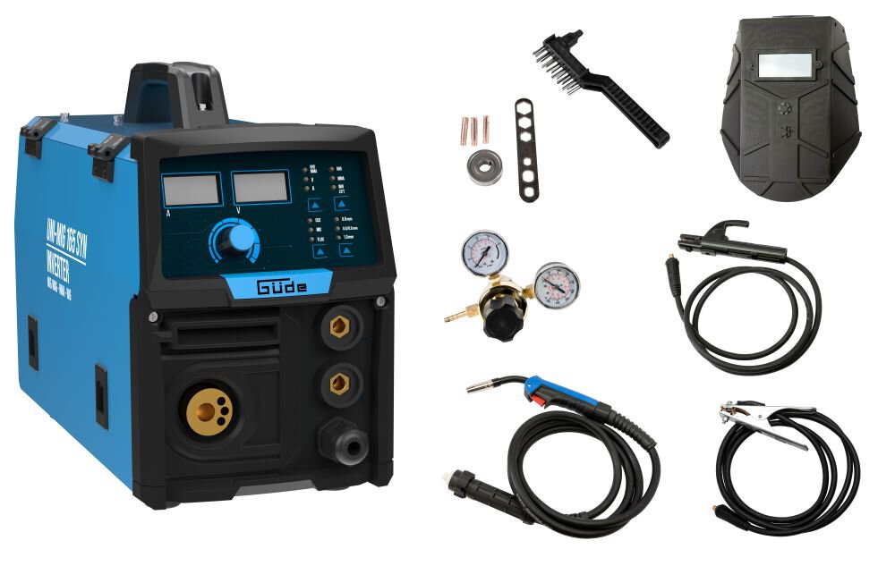 Das Inverter Schweißgerät Uni-Mig 165 SYN gehört zu den Universalgeräten der Inverterschweissgeräte in der Güde-Produktlinie. Mit dem Uni-Mig 165 SYN sind praktisch alle 4 Schweißverfahren möglich, MIG-MAG, MMA (Elektrodenschweißen), Flux (Fülldrahtschweißen) und schließlich WIG-Schweißen (optional). IGBT unterstützte Inverter-Technology für extrem schnelle Schaltprozesse und präziser Schweißstromregulierung, die das Schweißen von dünneren Blechen vereinfacht und die Schweißperlenbildung deutlich reduziert. Die bewährte Zusatzeigenschaften wie Anti-Stick, Hot Start und Arc Force sorgen für höchsten Schweißkomfort, auch unter schwierigen Bedingungen. Der neue, innovative, synergic-geregelte Drahtvorschub stellt sich, nach Auswahl von Schweißverfahren, Drahtstärke und Schweißstärke, automatisch auf die passende Geschwindigkeit ein. Vor allem auch Einsteigern und noch ungeübten Schweißern ermöglichen diese Zusatzfunktionen, sofort gute Schweißergebnisse. Elektrodenhalter und Masseklemme, sowie das Schweißschild und der Bürstenhammer, für MMA-Prozesse sind selbstverständlich serienmäßig im Lieferumfang enthalten. Gleiches gilt natürlich für den MIG-MAG-Brenner und den Druckregler für das Schutzgas.