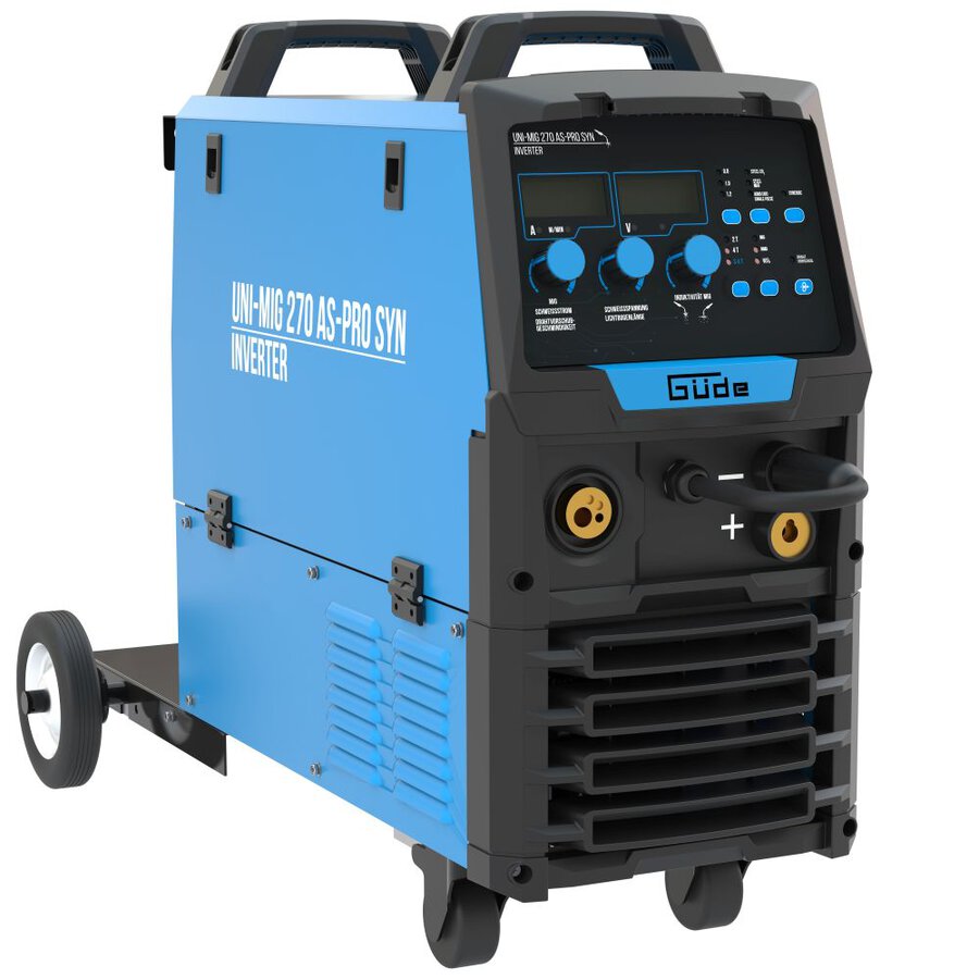 Das Uni-Mig 270 AS-Pro SYN, ist das Flaggschiff der Universalschweißinverter in der Güde-Flotte. Mit dieser professionellen Schweißmaschine sind alle Schweißverfahren, wie Elektrodenschweißen, MIG-MAG-Schweißen, Fülldraht, und schließlich ist mit der optionalen Ausrüstung #41692, auch WIG- Schweißen möglich. Mit einer Leistung von bis zu 270A-Schweißstrom verfügt das Gerät über ausreichend Power um auch schwere Schweißarbeiten über einen längeren Zeitraum durchführen zu können. Eine professionelle Ausstattung, wie der wahlweise synergic-gesteuerte, 4-Rollen-Drahtvorschub und das 4 Meter lange MB-25 Schlauchpaket, runden das starke Profil der Maschine ab. Zusatzfunktionen wie ARC-FORCE, ANTI-STICK und HOT-START, ermöglichen bereits gute Schweißergebnisse auch bei noch ungeübten Schweißern. Das Uni-Mig 270 AS-Pro SYN ist ein "Must- Have" für alle Schweißprofis und solche die es werden wollen.