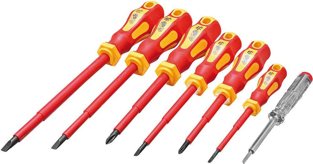 • vollisoliert • bis 250 V Inhalt: 4 Schlitz: 6,5 x 150, 5,5 x 125, 4 x 100 mm und 3 x 75 mm 2 Phillips: PH1 x 80 und PH2 x 100 mm 1 Spannungsprüfer: 3 x 60 mm, für bis zu 250 V