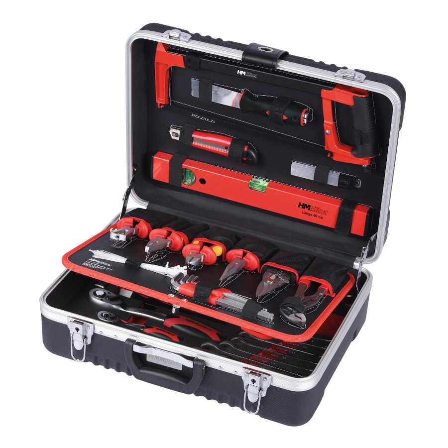 Werkzeugkoffer bestückt, 137-teilig, „ELEKTRO“ Umfangreich ausgestattet, unter anderem mit VDE-zertifizierten Werkzeugen bewährte Qualität für Handwerk und Werkstatt Bestückung: Eisensäge mit Sägeblatt, 300 mm Schaber mit Kunststoffgriff, 30 mm Cuttermesser 18 mm mit 5 Ersatzklingen Wasserwaage aus Aluminium, 400 mm VDE Abisolierzange 160 mm VDE Kombizange 180 mm VDE Seitenschneider 160 mm VDE Storchschnabelzange 200 mm Elektrikerschere 200 mm Wasserpumpenzange 250 mm Kabelbinder, Länge 160 mm SW-Stiftschlüsselsatz 9-tlg., 1.5–10 mm Tieflochmarker mit 6 Ersatzminen (Graphit und Wachs) Digitaler Multimeter inklusive Batterie VDE Kabelmesser 180 mm VDE Spannungsprüfer 140 mm, 125-250 V~ VDE Schraubendreher FL 3,0/4,0/5,5 mm VDE Schraubendreher PH1/PH2 Schraubendrehergriff mit 1/4“-Sechskantaufnahme Rollmeter 5 m Sechskanteinsätze 1/4“, von 4–13 mm Sechskanteinsätze 1/2“, von 10–22 mm Adapter 1/4" Umschaltknarre 1/4“ und 1/2“ Gleitgriff 1/4“, 115 mm Verlängerung 1/4“, 100 mm, 1/2“, 125 mm Universalgelenk 1/4" und 1/2" PH-/PZ-/FL-/TX-/TXB-/SW-Bitsatz 32-tlg., mit Magnethalter Schlosserhammer 300 g mit Fiberglasstiel Flach- und Spitzmeißel 200 mm Ring-Gabelschlüsselsatz 9-tlg., 8–22 mm Aluminium-Werkzeugkoffer, verschließbar, 465x360x165 mm
