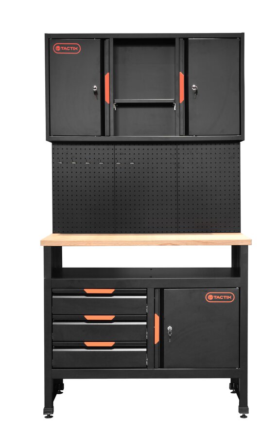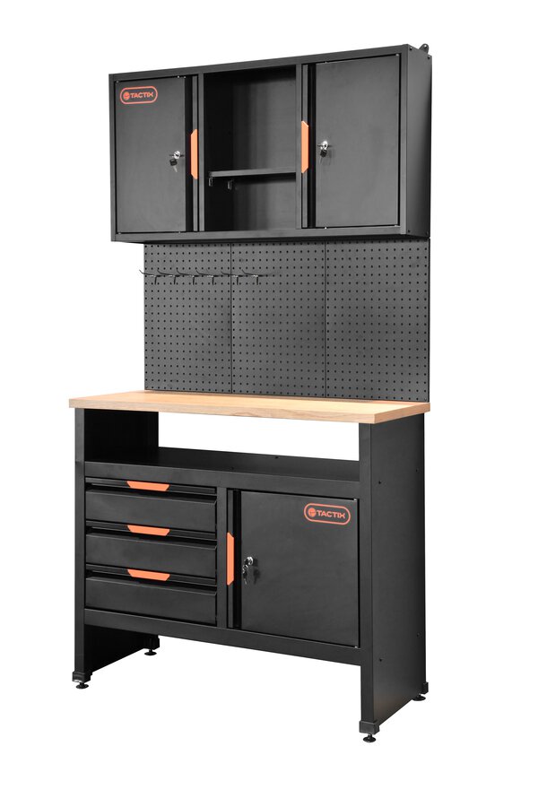 Das Werkstatt-Modulsystem 3 in 1 ist ein praktisches, Einrichtungsset für Werkstatt, Garage, Keller oder Hobbyraum und lässt sich dank der modularen Bauweise flexibel platzieren. Zwei Wandschränke mit Mittelteil sowie ein Werkstattwagen bieten Stauraum für Maschinen, Werkzeuge und weitere Ausrüstung. An der Lochwand können mit Hilfe der mitgelieferten Haken zusätzliche Werkzeuge übersichtlich aufhängt werden. Alle Teile sind abschließbar.