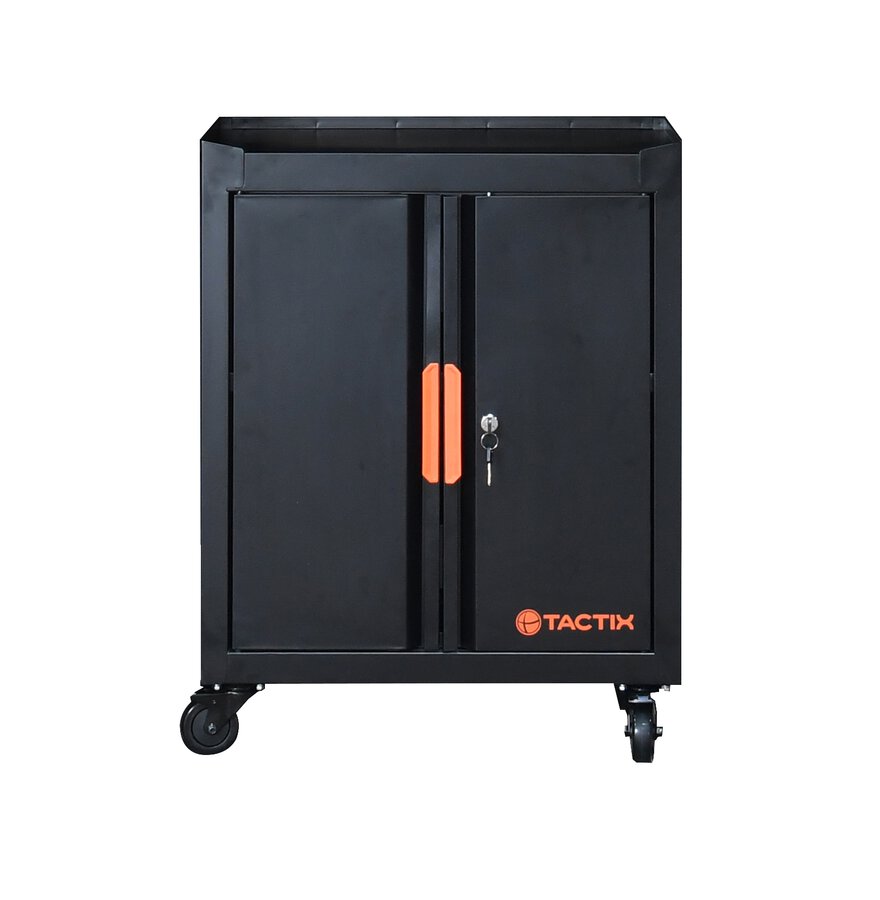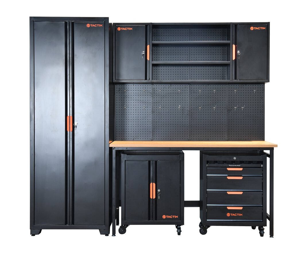 Das Werkstatt-Modulsystem ist ein praktisches, Einrichtungsset für Werkstatt, Garage, Keller oder Hobbyraum und lässt sich dank der modularen Bauweise flexibel platzieren. Ein großer Schrank, zwei Wandschränke mit Mittelteil sowie zwei verschiedene Werkstattwagen bieten genügend Stauraum für Maschinen, Werkzeuge und weitere Ausrüstung. Alle Teile sind abschließbar.