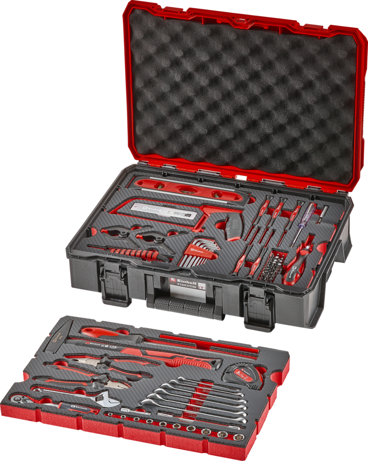 1x Schlosserhammer (300 g, Fiberglasgriff, DIN 1041, TÜV GS geprüft), 1x Phasenprüfer (200–250 V, 140 mm, TÜV GS geprüft), 1x Kombizange (160 mm, CrV-Stahl), 1x Seitenschneider (160 mm, CrV-Stahl), 1x Rollgabelschlüssel (150 mm, CrV-Stahl), 6x Gabel-Ringschlüssel (Ø 6 / 8 / 10 / 11 / 12 / 13 mm, CrV-Stahl), 1x Bithalter (60 mm, Edelstahl), 29x Bits in 25 mm (PH1 / 3x PH2 / PH3 / PZ1 / 3x PZ2 / PZ3 / T10 / 3x T15 / 4x T20 / 3x T25 / T30 / H3 / H4 / H5 / H5,5 / H6 / SL3 / SL5, S2-Stahl, 1/4" C 6.3 Schaft), 1x Bit-Adapter (1/4" Vierkant zu 1/4" Hex), 1x Bit-Ratschenschraubendreher (1/4" Aufnahme, 72 Zähne, 40Cr-Stahl), 1x Umschaltknarre (1/4", 72 Zähne), 5x Präzisionsschraubendreher (SL1,5 / SL3 / PH00 / PH0 / T10, CrV-Stahl, verchromt), 8x Sechskant-Stiftschlüssel (Ø 1,5 / 2 / 2,5 / 3 / 4 / 5 / 5,5 / 6 mm, CrV-Stahl, Kugelkopf), 10x Stecknüsse (Ø 4 / 5 / 6 / 7 / 8 / 9 / 10 / 11 / 12 / 13 mm, CrV-Stahl, 1/4"-Aufnahme), 1x Stecknuss-Verlängerung (50 mm, 1/4"), 1x flexible Stecknuss-Verlängerung (148 mm, 1/4"), 1x Wasserwaage (225 mm, 3 Libellen, Aluminium, magnetisch), 1x Rollbandmaß (3 m), 1x Bleistift (175 mm), 1x Metallfeile (200 mm, halbrund, Wälzlagerstahl T12), 1x Bügelsäge (150 mm Blattlänge, SK4-Stahl, geschränkte Zahnung, 32 ZpZ), 1x Abbrechklingenmesser (18 mm Klinge, extra scharf), 10x Ersatzklingen (18 mm, extra scharf), 2x Leimzangen (90 mm, Nylon), 1x E-Case-Koffer (44 x 33 x 13 cm)
