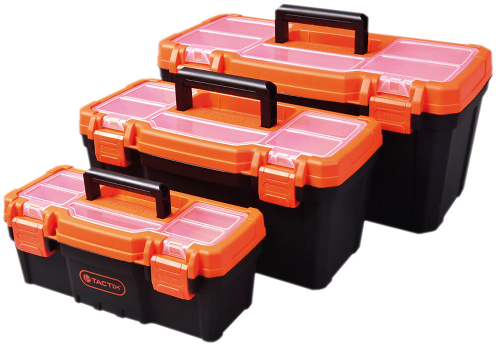 in den Größen: - 50 x 26 x 24 cm - 41 x 21 x 20 cm - 33 x 15 x 13 cm jeweils mit 5 Sortimenterboxen im Deckel und Werkzeugträger, komplett aus Kunststoff