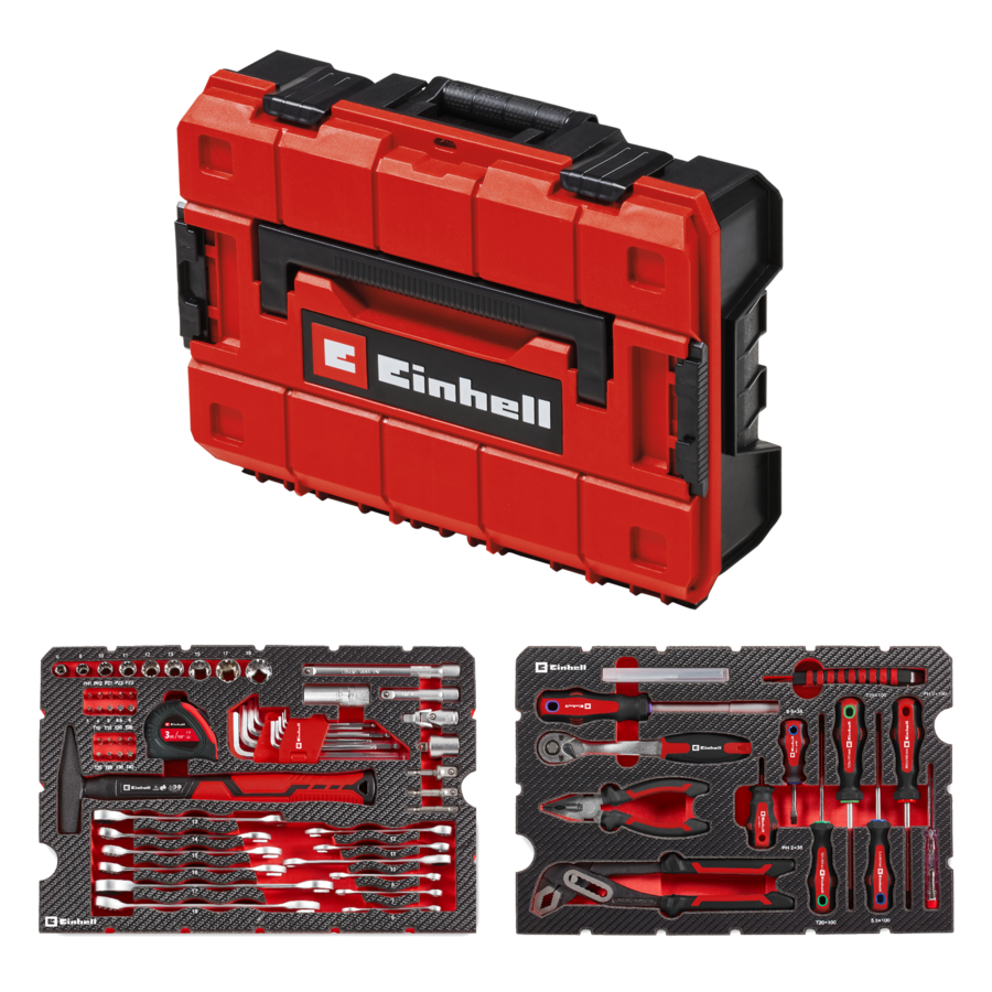 1x Schlosserhammer (300 g, Fiberglasgriff, TÜV GS geprüft), 1x Phasenprüfer (200–250 V, 140 mm, TÜV GS geprüft), 1x Kombizange (160 mm, CrV-Stahl), 1x Wasserpumpenzange (250 mm, CrV-Stahl), 6x Schraubendreher (PH2 x 100 mm / SL5,5 x 100 mm / T20 x 100 mm / T25 x 100 mm / PH2 x 38 mm / SL5,5 x 38 mm, CrV-Stahl, verchromt), 1x Bit-Schraubendreher (1/4" Aufnahme, magnetisch, CrV-Stahl), 18x Bits in 25 mm (PH1 / PH2 / PZ1 / 2x PZ2 / T10 / T15 / 2x T20 / 2x T25 / T30 / T40 / H3 / H4 / H5 / H5,5 / H6, S2-Stahl, 1/4" C 6.3 Schaft), 9x Stecknüsse (Ø 6 / 8 / 10 / 11 / 12 / 13 / 15 / 17 / 19 mm, CrV-Stahl, 3/8"-Aufnahme), 9x Gabel-Ringschlüssel (Ø 6 / 7 / 8 / 11 / 12 / 14 / 15 / 16 / 19 mm, CrV-Stahl, DIN 3113), 3x Ring-Ratschenschlüssel (Ø 10 / 13 / 17 mm, CrV-Stahl), 1x Umschaltknarre (3/8", 72 Zähne), 2x Stecknuss-Verlängerungen (75 / 150 mm, 3/8", CrV-Stahl), 1x Kardangelenk (3/8", CrV-Stahl), 1x Zündkerzeneinsatz (Ø 16 mm, 3/8"), 3x Steckschlüssel-Adapter (1/4" / 3/8" / 1/2", CrV-Stahl), 1x Gleitstück (3/8" Aufnahme, 3/8" Antrieb), 9x Sechskant-Stiftschlüssel (Ø 1,5 / 2 / 2,5 / 3 / 4 / 5 / 6 / 8 / 10 mm, CrV-Stahl, Kugelkopf), 1x Rollbandmaß (3 m, Gürtelclip, Selflock-Funktion), 1x Abbrechklingenmesser (18 mm Klinge, extra scharf), 10x Ersatzklingen (18 mm, extra scharf), 1x E-Case-Koffer (44 x 33 x 13 cm)