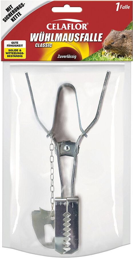 bewährte Zangenfalle aus verzinktem Stahl, hohe Fangeffizienz durch beidseitige Fangmöglichkeit, durch Stellplättchen einfach auszustellen, Köderplättchen durch Kette mit Falle verbunden, sehr solide und witterungsbeständig, wiederverwendbar