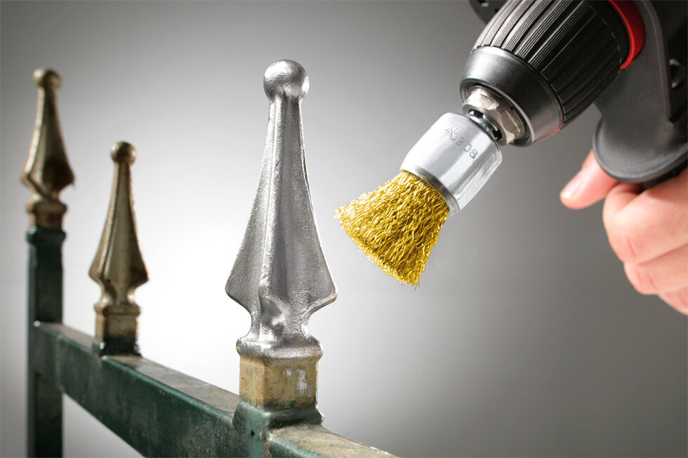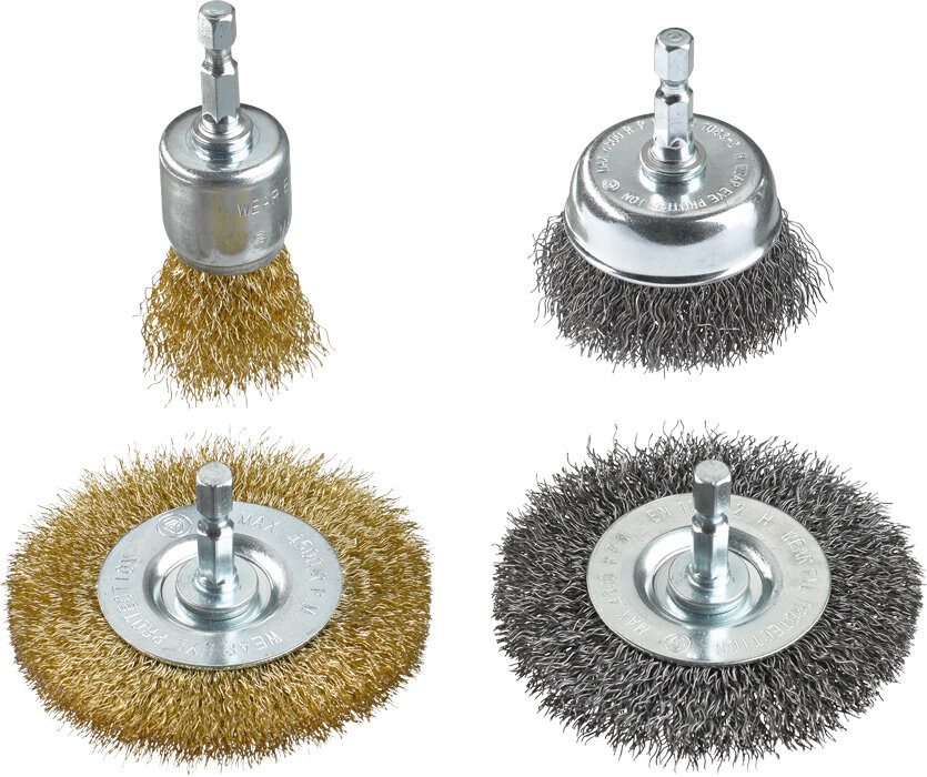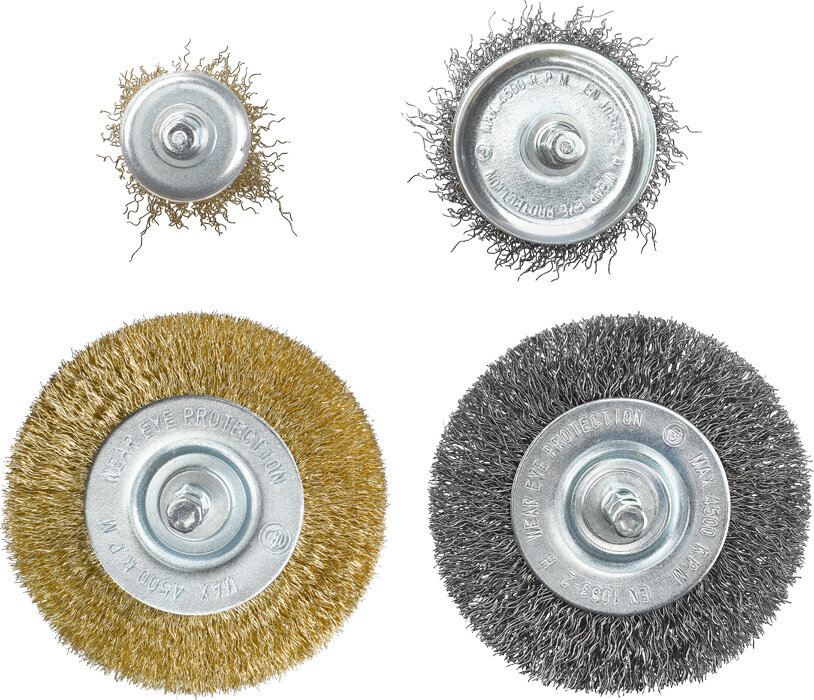 Dieser 4-teilige kwb Bürsten-Reinigungssatz darf in keiner Heimwerkstatt fehlen. Denn das Entfernen von Farben, Lacken, Rost, Graten und sogar Mörtelresten sind mit diesen Bürsten ein Kinderspiel. Mit der Scheibenbürste und der Topfbürste aus Stahldraht werden im Außenbereich Metalle entrostet sowie Hölzer und Metalle entgratet und gereinigt. Selbst zur Vorbereitung von Löt- und Schweißarbeiten sind diese Bürsten hervorragend geeignet. Der gewellte, rostfreie Stahldraht der Topfbürste sorgt für einen leistungsstarken Auftritt. Die zweite Scheibenbürste und die Pinselkopfbürste, beide ausgestattet mit gewelltem Messingdraht, sind ideal für erstklassige und feine Schleif- und Polierarbeiten. Diese zwei ausgezeichneten Messingbürsten liefern beeindruckende Arbeitsergebnisse insbesondere für Metalle und Steine. Alle Bürsten haben einen 1/4" E 6.3 Antrieb für den Einsatz mit handelsüblichen Bohrmaschinen. Dadurch haben die Bürsten mit Stahldraht einen gewaltigen Vorteil gegenüber dem Einsatz in Winkelschleifern: erheblich reduzierter Funkenflug! Die Durchmesser der Bürsten sind speziell auf Heimwerkerbedürfnisse abgestimmt: