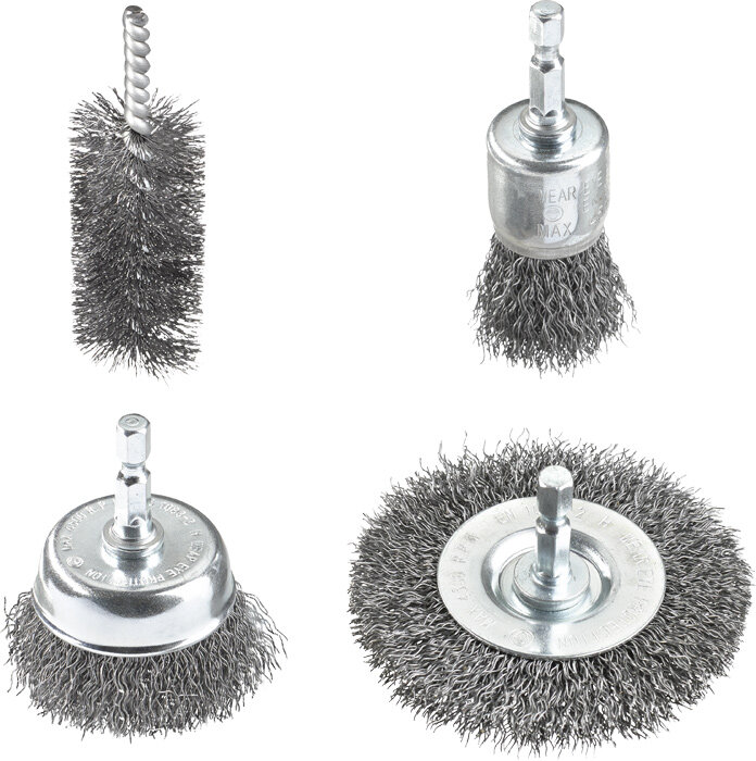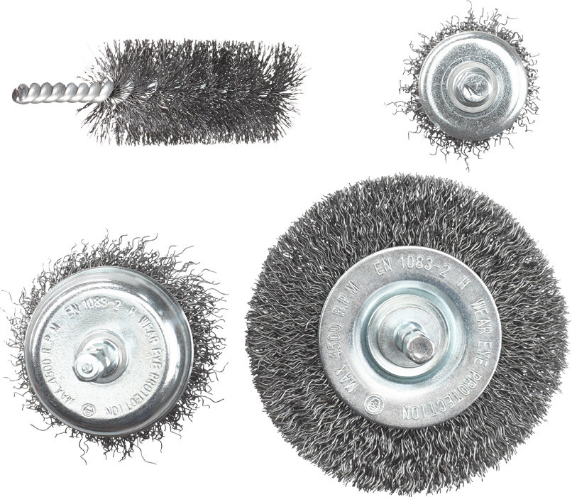 Der kwb Bürsten-Universalsatz besteht aus einer Scheibenbürste, Ø 75 mm, einer Topfbürste, Ø 50 mm, einer Pinselkopfbürste, Ø25 mm und einer Spiralbürste, Ø20 mm.