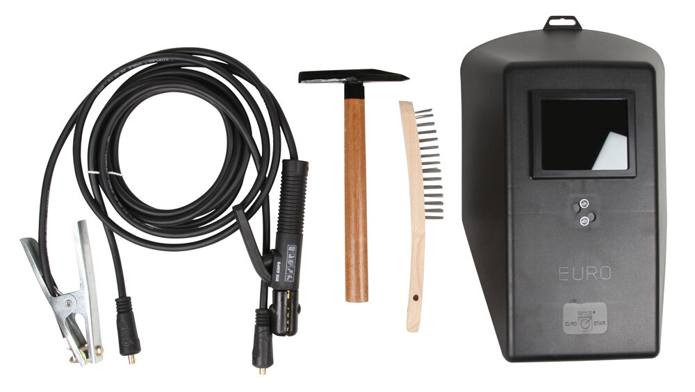Schweißschirm, Elektrodenhalter, Schlackenhammer und Stahldrahtbürste<br />