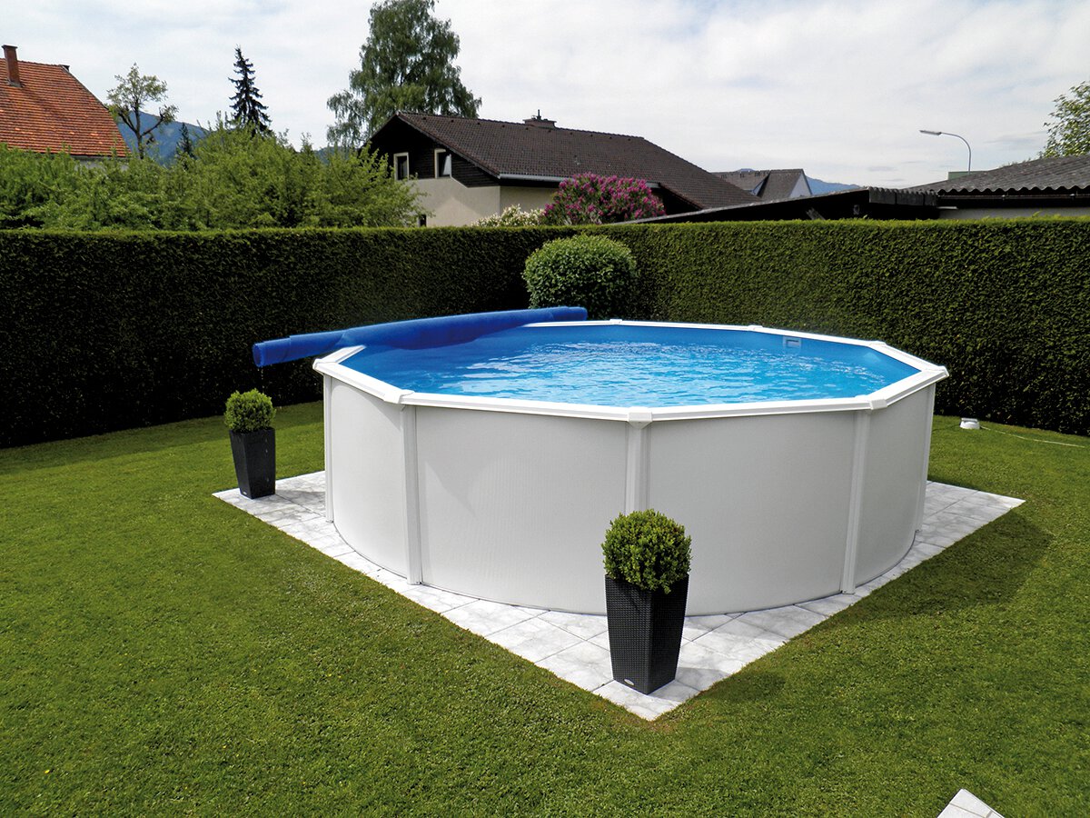 Zum weiteren Zubehör im Lieferumfang zählen häufig Anschlussschläuche, ein Skimmer und eine Einlaufdüse sowie die Einstiegsleiter. Je nach Modell ist ein teil- oder vollversenkter Einbau möglich. Natürlich können Sie den Aufstellpool auch einfach freistehend platzieren.